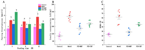 Effect of FCB-MDF on glucose metabolism in mice. (A) Fasting blood glucose level in mice at different feeding time periods; (B,C) scatter spacing diagram of insulin resistance in mice after 12 weeks of intervention. Data are expressed as means ± standard deviations (n = 9). Different superscript letters (a–c) denote statistically significant differences (p < 0.05).