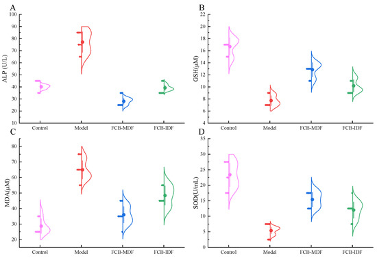 In order to further clarify the protective effect of FCB-MDF on liver tissue, the parameters related to oxidative stress and liver injury were measured. As shown in Figure 3, a high-fat diet significantly reduced the activity of antioxidant glutathione (GSH) and superoxide dismutase (SOD) (p < 0.05), increased the content of malondialdehyde (MDA) (p < 0.05), which was the end product of lipid oxidation, and also increased the alkaline phosphatase (ALP) activity (p < 0.05), which indicated impaired liver function. Compared with the control group, there was no significant difference in the SOD activity, ALP activity or MDA content in the FCB-MDF group (p > 0.05), while the GSH activity was significantly reduced (p < 0.05). FCB-IDF and FCB-MDF could not only inhibit the production of MDA, but also significantly increase the activity of SOD and the content of GSH, and reduce the activity of ALP, indicating that the liver damage was reduced.