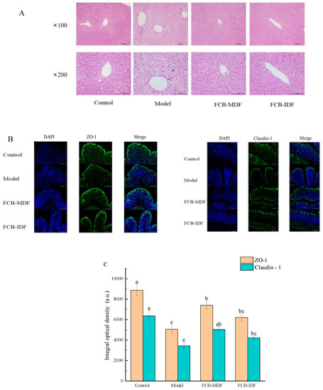Effect of FCB-MDF on histopathology of mice. (A) The result of H&E staining; (B,C) the damage degree of tight junction proteins ZO-1 and Claudin-1 in mouse colon tissue. Data are expressed as means ± standard deviations (n = 9). Different superscript letters (a–c) denote statistically significant differences (p < 0.05). Abbreviations: ZO-1, Zona Occludens 1.