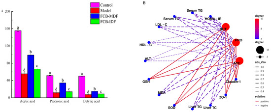 SCFAs in the cecum contents of mice after 12 weeks of intervention (A) and their network correlation diagram with various biochemical indicators (B). Data are expressed as means ± standard deviations (n = 9). Different superscript letters (a–d) denote statistically significant differences (p < 0.05). Abbreviations: TG, total triglyceride; TC, total cholesterol; LDL-C, low density lipoprotein; HDL-C, high density lipoprotein; ALP, alkaline phosphatase; TBA, total bile acid; GSH, glutathione; MDA, malondialdehyde; SOD, superoxide dismutase; ZO-1, Zona Occludens 1; BUT, butyric acid; PRO, propionic acid; ACE, acetic acid.