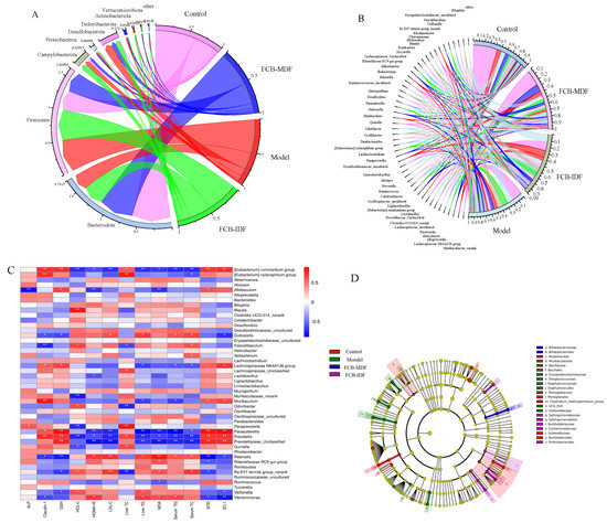 Effect of FCB-MDF on intestinal microflora in mice. (A) Chord chart of phylum level; (B) chord chart of genus level; (C) heatmap of the relationship between the proportion of microbiota at the genus level and various biochemical indicators related to obesity. The colors range from blue (negative correlation) to red (positive correlation). Significant correlations are noted by * p < 0.05 and ** p < 0.01. (D) LEfSe analysis of fecal microflora structure.
