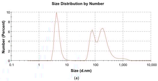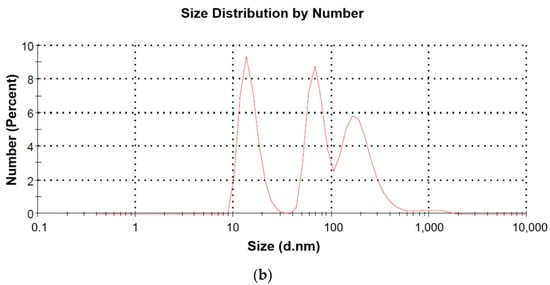 The average diameter of Ch(GB)NPs (without initial sonification) in the tested sample was 454.2 nm. A total of 5 min of sonification allowed to reduce the average diameter of nanoparticles to the level of 374.9 nm, while 10 min of sonification allowed for obtaining nanoparticles with the smallest average diameter of 358.9 nm. Figure 2a shows the most numerous fractions (fractions with an average diameter of 4.6, 86.3 and 269.2 nm) related to the unit measurement of a small sample of the obtained nanoparticles (without preliminary sonification). Figure 2b shows the most numerous fractions of the sample after 10 min of sonification (fractions with an average diameter of 14.87, 71.97 and 202.9 nm).