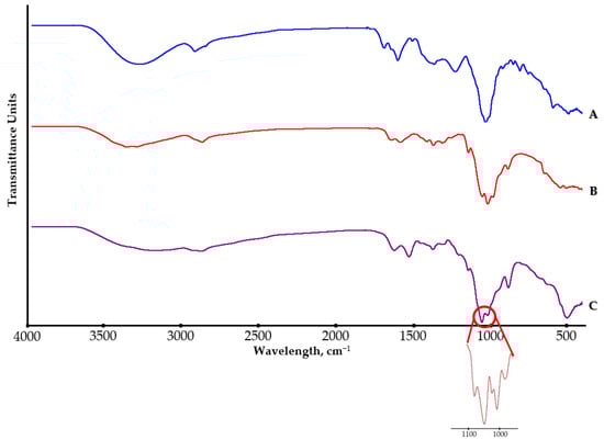 In the spectrum of chitosan at the wavelength of 3354 cm−1, the peak characteristic of O–H stretching bonds can be observed. The bands at the wavelength of 2871 cm−1 for the investigated polymer are assigned to symmetric and asymmetric C–H bonds. At 1650 cm−1, there is a characteristic band stretching the C=O bond in the N-acetyl group (amide I) and at 1589 cm−1—a band characteristic for the amino group (amide II). The peaks at 1418 cm−1 and 1319 cm−1 are characterized by symmetrical deformations of CH2 and CH3 bonds. The spectrum also contains typical peaks for C–O–C bonds, at 1150 cm−1 for a glycosidic bond and at 1059 cm−1 for a saccharide ring bond. The band present at 894 cm−1 is assigned to the hydroxyl group.