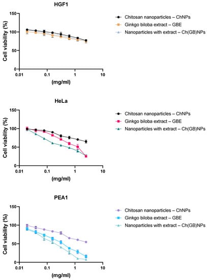 Our studies showed moderate cytotoxic effects for the normal HGF-1 cell line after treatment with chitosan nanoparticles, the Ginkgo biloba extract and a combination of chitosan nanoparticles with the plant extract in the tested concentration range. In turn, all applied combinations showed a cytotoxic effect for the two tested HeLa and PEA1 cancer cell lines. For the HeLa cancer cell line, a weaker cytotoxic effect was demonstrated after treatment with chitosan nanoparticles. IC50 for the Ginkgo biloba extract was about 0.975 mg/mL, and for the chitosan nanoparticles in combination with the IC50 extract, it was about 0.505 mg/mL, which showed a strengthening effect. For the PEA1 cancer cell line, a stronger cytotoxic effect was observed for the extract of Ginkgo biloba with IC50 at about 0.335 mg/mL, and for the extract with chitosan nanoparticles, it was about 0.178 mg/mL. In both cases, a strengthening effect was observed for the extract with chitosan nanoparticles (Figure 5).