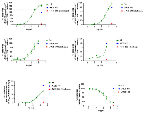 Concentration–response curves of compounds 15, 18, 26, 35, 55, and 57 in a cAMP-based functional assay. The curves show the effect of increasing concentrations of ligands on NKH477-induced cAMP levels in stable CHO cells expressing the human recombinant CB2 receptor.