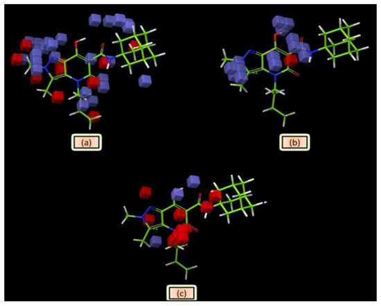 Pictorial representation of the contour plots generated for compound 54 in the context of (a) hydrophobic/non-polar interactions, (b) hydrogen bond donor effects, and (c) electron-withdrawing groups.