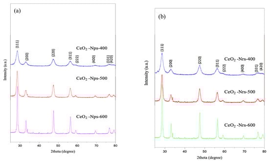 According to the XRD pattern for all catalysts, the diffraction peaks of CeO2 nanostructures calcined at 400 °C are quite broad, indicating that the catalyst’s crystallite sizes are petite [17]. On the other hand, the diffraction peaks become sharper and the line broadening decreases as the calcination temperature increases to 500°C, which is attributed to the increased product size and demonstration of good crystallinity. These observations can be related to Table 1, which shows the crystallite size of all the CeO2 nanostructures corresponding to the (111) plane with different calcination temperatures at 400, 500 and 600 °C for 2 h. As calcination temperature increased from 400 to 600 °C, crystallite size gradually increased for all CeO2 nanostructure samples. This result can be confirmed by a study by Gharagozlou [18], where they suggested that during the calcination process, two or more particles tend to fuse together by melting through their surfaces. As a result, the substantial increase in crystallite size as calcination temperature rises indicates the formation of larger particles. It can also be observed that CeO2-Nps-400 has the smallest crystallite size, followed by CeO2-Nrs-400 and CeO2-Ncs-400.