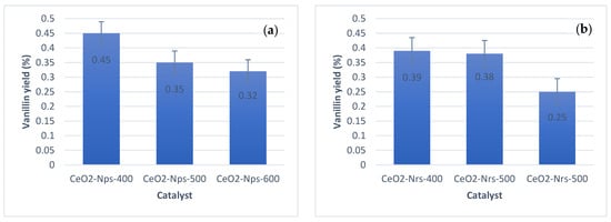 Figure 11 illustrates vanillin production from biomass synthesized with 0.3 g of heterogeneous catalyst treated in a microwave for 20 min at 170 °C under 300 W of microwave power output. The best operating conditions for time, temperature, catalyst loading and microwave power output were selected to produce vanillin directly from biomass and extract lignin from 2 g of Kenaf stalks. According to Figure 11 CeO2-Nps-400 was observed producing the highest amount of vanillin for the oxidation of extracted lignin and the direct oxidation of biomass, with vanillin yields of 4.32% and 3.84%, respectively. Due to the chemical structure of cellulose and hemicellulose, we anticipated that only lignin would produce vanillin in the direct oxidation reaction, while cellulose and hemicellulose would produce sugars. Because lignin was isolated as an active ingredient for conversion to vanillin, the extracted lignin demonstrated a higher vanillin yield than direct biomass. Vanillin is produced as a result of the breakdown of aryl ether linkages in β-O-4 bonds and Cα-Cβ cleavage between lignin structures during the oxidation process [48]. Lower vanillin formation resulted from oxidizing biomass without first separating lignin from cellulose and hemicellulose.