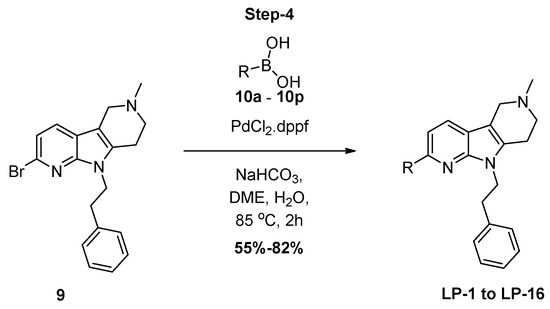 - General procedure for the synthesis of 6-methyl-9-phenethyl-6,7,8,9-tetrahydro-5H-pyrrolo [2,3-b:4,5-c’]dipyridine derivatives (LP-1- LP-16)