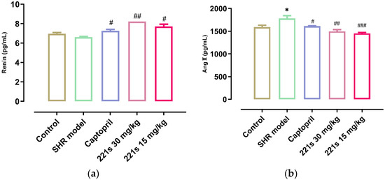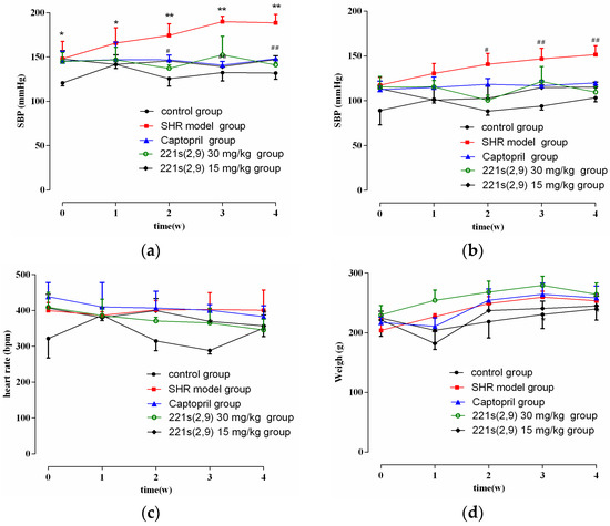 As shown in Figure 1a,b, the blood pressure (BP) in the control was stable and the systolic blood pressure (SBP) and diastolic blood pressure (DBP) of SHR model group increased with time. However, the treatment of 221s (2,9) and captopril alleviated the enhancement in the SBP and DBP of the SHR model group (p < 0.05). In addition, the 221s (2,9) group showed a decrease in SBP and DBP by 50 mmHg and 35 mmHg, respectively. The antihypertensive effect of the 221s (2,9) group exhibited no significant difference compared to the Captopril/SHR group. As illustrated in Figure 1c,d, 221s (2,9) showed no effect on the heart rate and body weight of rats. The above results indicated that 221s (2,9) has equal or even better effects on hypertension than captopril.