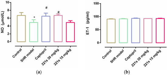 The effect of 221s (2,9) on NO and ET-1 O of rats resum. Note: * p < 0.05 vs. control; # p < 0.05 vs. model group. (a) NO; (b) ET-1.