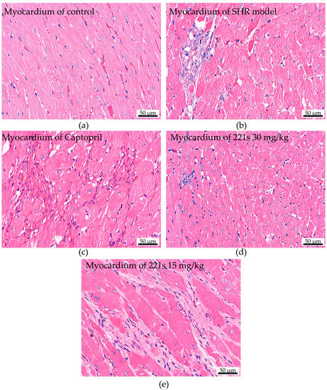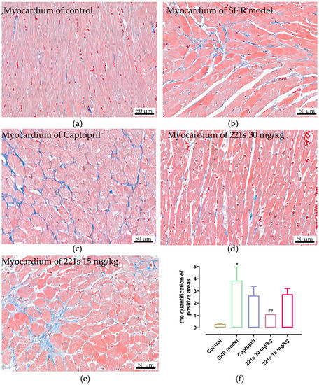 The effect of 221s (2,9) on cardiac histopathological changes in rats (×400). Note: * p < 0.05, vs. control; ## p < 0.05 vs. Captopril group 4. (a) myocardium of control; (b) myocardium of SHR model; (c) myocardium of Captopril; (d) myocardium of 221s 30 mg/kg; (e) myocardium of 221s 15 mg/kg; (f) statistical analysis graph.