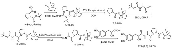 According to the synthetic route of Scheme 1, 221s (2,9) (Tanshinol acyl-l-alanyl-l-proline bornyl ester) was prepared from borneol, N-Boc-l-proline, N-Boc-l-alanine, and tanshinol via condensation, esterification, deprotection and an amidation reaction.