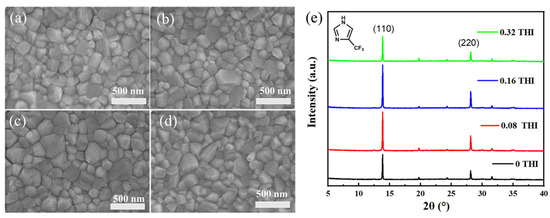 Top-view SEM images of perovskite films: (a) 0 THI, (b) 0.08 THI, (c) 0.16 THI and (d) 0.32 THI; (e) XRD patterns of perovskite films based on different concentration of THI; inside is the molecular structure of THI.