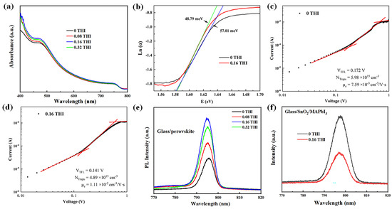 (a) UV-Vis spectra of perovskite films based on different concentrations of THI in the perovskite precursor solution; (b) Urbach energy plot; J–V characterizations of electron-only devices with structure of ITO/SnO2 (20 nm) /MAPbI3 (260 nm)/PCBM (70 nm)/Ag (100 nm); (c) control device and (d) 0.16 THI device; (e) PL spectra of perovskite films on glass; (f) PL spectra of perovskite films on SnO2/glass.