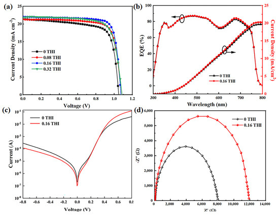 (a) J−V curves of PSCs based on different THI doping concentrations; (b) IPCE curves of PSCs, (c) dark I-V curves and (d) Nyquist plots of EIS of the control and 0.16 THI devices.