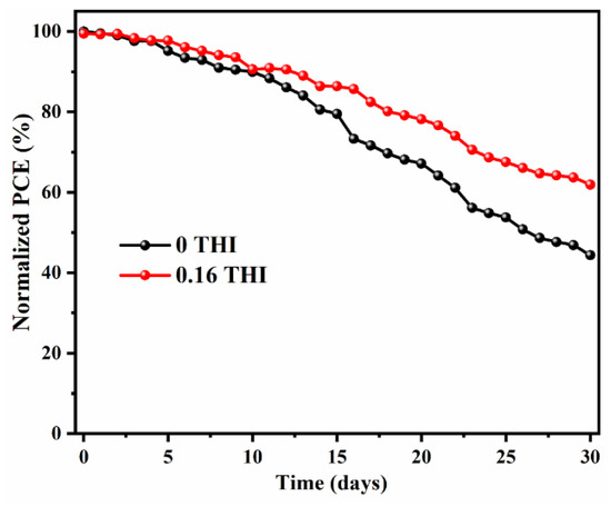 In addition to improving efficiency, device stability is also critical in achieving commercialization. The 30-day storage stability of PSCs without encapsulation was checked by storing them in a N2-filled glove box (with the content of both water and O2 being less than 1 ppm) and tested daily. The normalized PCEs as a function of time were recorded, as shown in Figure 5. The J−V curves of the PSCs after being stored for 1 day and 30 days are shown in Figure S4. After 30 days of storage, the PCE of the 0.16-THI-added device was maintained at 61.9% of its initial value, while it dropped to 44.3% for the control device. Obviously, the device based on THI-doped perovskite was more stable than the control device.