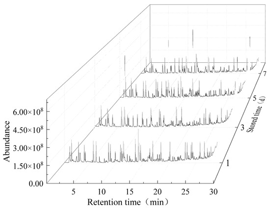 Total ion chromatogram of volatile compounds in chilled Tan mutton during storage.