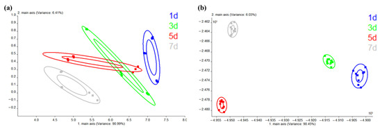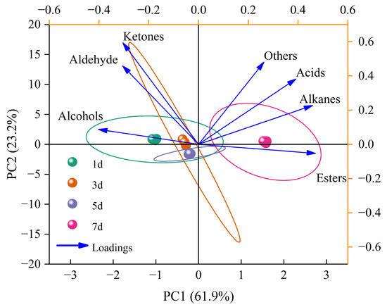 To obtain more information of the volatiles and discriminate Tan mutton at different storage stages, principal component analysis (PCA), partial least squares discriminant analysis (PLS-DA), and volcano plot analysis were performed. PCA can realize data transformation of feature vector matrix and can transform correlation variables into linear uncorrelated variables with minimum variance information loss through dimensionality reduction, thus simplifying further analysis [48]. As shown in Figure 3, the accumulative variance contribution of the first two principal components were 61.9% and 23.2% (a total of 85.1%), suggesting that the two principal components covered almost all volatile information. Obviously, 3d and 5d were relatively close and far away from 1d and 7d in spatial regions, especially 7d, indicating that 3d and 5d had relatively similar volatile components and 7d was significantly different from the others. The differences in volatiles between 1d and 7d were mainly caused by PC1, and their projection positions were located on the negative and positive axes of the PC1 axis, respectively. These results demonstrated that four storage periods in chilled Tan mutton could be separated by the HiSorb-TD-GC-MS analysis of volatiles and divided into three groups (1d, 3d, and 5d, 7d) by PCA. In addition, the PCA loadings of alcohols, aldehydes, and ketones were associated with 1d, 3d, and 5d, while esters, alkanes, acids, and others were associated with 7d.