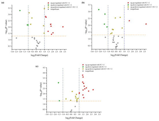 Volcano plot of volatile compounds in chilled Tan mutton during storage: (a) 3d vs. 1d; (b) 5d vs. 3d; (c) 7d vs. 5d. The dotted lines in yellow and blue represented p value = 0.05, fold change = 0.5 and 2, respectively.