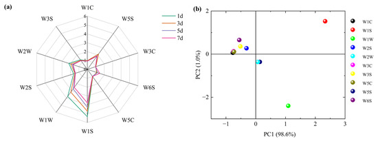(a) Radar chart of E-nose sensors in chilled Tan mutton during storage; (b) PCA of E-nose sensors in chilled Tan mutton during storage.