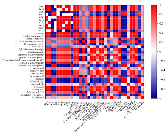 The E-nose system could successfully identify the chilled Tan mutton at different storage stages by the volatile profiles. Simultaneously, the contents of volatile compounds were analyzed by HiSorb-TD-GC-MS. A combination of these two techniques could achieve comprehensive evaluation and identification of volatiles in chilled Tan mutton. The volatiles with high contents were selected as the main volatile components to perform the correlation analysis with E-nose sensors. As shown in Figure 8, ten sensors could be roughly separated into two categories: W1C, W5S, W5C, W1S, W1W, W2S, W2W, W3C, W6S, and W3S. Among them, W1C, W5S, W5C, W1S, W1W, W2S, and W2W were positively correlated with n-hexane, cyclopropane, pentyl-, hexanoic acid, methyl ester, heptanoic acid, methyl ester, propanoic acid, hexanoic acid, 1-hexanol, and 1-octen-3-ol. Esters, acids, and alcohols were the main volatile components in chilled Tan mutton, which would explain their high correlation with the most E-nose sensors. Conversely, W3C, W6S, and W3S were found to be positively correlated with aldehydes (hexanal, 2-octenal, (E)-), ketone (2,3-butanedione), and other volatiles (decanoic acid, methyl ester, hexadecen-1-ol, trans-9-). Interestingly, they were located in the second quadrant with the short distance distribution in PCA plot of E-nose sensors (Figure 6b), indicating a certain similarity in their sensitivity to volatile substances. These results suggest that E-nose can obtain comprehensive contour information through the sensitivity of ten sensors to different volatiles so as to realize the identification of chilled Tan mutton at different storage stages.