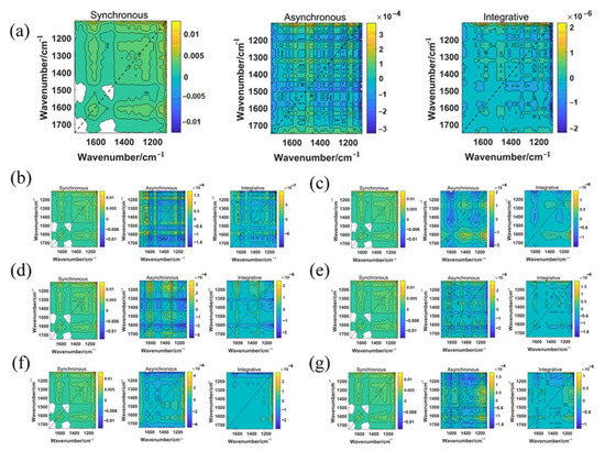 To improve the resolution of the spectra and extract more information [10], the one-dimensional infrared spectrum was extended into two-dimensional correlation spectroscopy (2D-COS), which can be divided into asynchronous correlation spectra, synchronous correlation spectra and integrative spectra [11]. Two-dimensional correlation spectroscopy (2D-COS) is a dynamic spectroscopy that is induced by external perturbations. These perturbations can range from low-frequency sinusoidal disturbances to factors such as temperature, concentration, pressure, reaction time and magnetic field [12]. This novel method can provide more comprehensive spectral information of the samples and can effectively solve the problem of spectral overlap.