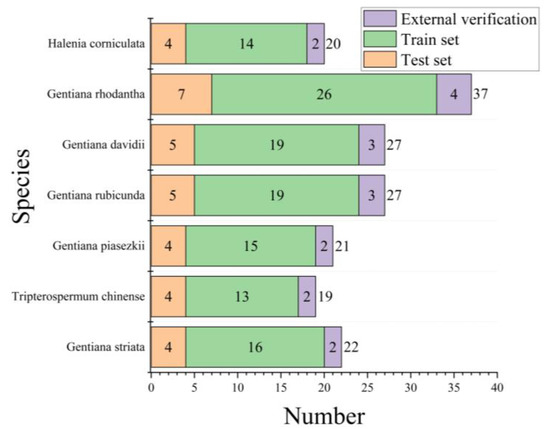 In this study, 173 gentian samples were collected from seven different species. All samples were identified by Associate Professor Xianxiang Xu of the College of Medicine at Huaqiao University. Fresh gentian was washed with deionized water, and then treated by being placed in an electric blast dryer and dried at a constant temperature of 60 °C. The resulting dried powder samples were crushed using a high-speed crusher and sieved through a 100 mesh sieve. The processed gentian was stored in sealed polyethylene bags under dry conditions, awaiting further processing.