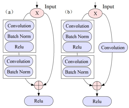 CNN is a deep learning architecture in which VGGNet (visual geometry group network) [33] and GoogLeNet [34] have achieved impressive performance by increasing the number of layers in the network. However, some problems such as vanishing or exploding gradients can arise by increasing the number of layers in deep learning, which can cause the training and testing error rates to increase. These issues are not related to overfitting and must be carefully addressed during model development [35].The introduction of ResNet has significantly improved this challenge. ResNet is designed to preserve information integrity and simplify the learning objectives and difficulty through the use of skip connections with residual mapping [36] Additionally, ResNet is able to increase accuracy through increased depth [37]. In ResNet, the internal residual modules utilize shortcut connections, which allow the direct transfer of the input X to the output. This mechanism ensures the integrity of information throughout the network. The output result is computed as H(x) = F(x) + X, where x represents the shallow output, and H(x) represents the deep output. Consequently, the objective function is reformulated as F(x) = H(x) − x, and the residual block structure of the ResNet model [19] is depicted in Figure 6. The residual block can be classified into two categories based on the dimensions of the input X and the output F(x). If they have the same number of dimensions, the identity block is used, as shown in Figure 7a. Alternatively, if they have different dimensions, the convolution block is used, as shown in Figure 7b. Based on these two types of residual blocks, ResNet was constructed, with the model structure depicted in Figure 8.