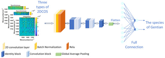 During the model building process, the learning rate was set to 0.01 and the weight attenuation coefficient was 0.0001. Firstly, the 2D-COS images of synchronous, asynchronous and integrative two-dimensional spectra were inputted, respectively. A convolution layer was applied to the input data, and BatchNorm was used to normalize the data, which effectively prevents overfitting. Subsequently, a non-saturated non-linear activation function ReLu was applied to the data, and the output was fed into six identification blocks and four convolution blocks to extract features. Then, global average pooling was performed for each feature map to reduce the number of parameters, effectively avoiding overfitting and converting the data into one-dimensional data. After all the convolution and pooling operations, the obtained feature maps were flattened by rows and concatenated into vectors, which were then fed into the full connection layer.