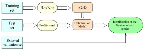 The identification strategy for closely related gentian species based on ResNet is shown in Figure 9. To enhance the model’s performance, data augmentation was performed, followed by weight update and cross-entropy loss reduction using the stochastic gradient descent (SGD) method [38]. The optimal model was obtained when the iteration number or error reached the threshold. The trained neural network was then utilized to classify the images in the test set via forward propagation (feedforward). Finally, the model’s generalization ability was assessed using an external validation set.
