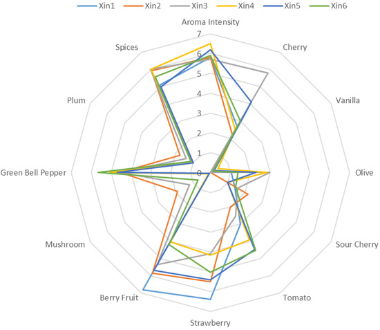 A trained sensory panel described the aroma characteristics of the six Xinomavro wines produced in this study (Figure 2 and Figure 3). The ANOVA results (Table S1) indicated significant differences among the aroma intensity of the wines and mean scores for cherry, vanilla, olive, sour cherry, tomato, strawberry, berry fruit, mushroom, green bell pepper, plum, and spices (Figure 2). Wine sample Xin4 had the highest total aroma intensity. Wine sample Xin2 presented the highest mean score for the mushroom descriptor, but did not significantly differ from Xin3 for plum (Table S1). The score for these attributes was quite low (<2), which indicated that they are not sensory attributes that could characterize the varietal aroma profile. Xin3 presented the highest value in the cherry attribute, while Xin1 was the highest in strawberry and berry fruit attributes. For the tomato attribute, the highest value was presented in Xin6, followed by Xin5 and Xin4, with no significant differences between them, whereas green bell pepper was most intense in sample Xin6. Wine samples Xin3, Xin4, and Xin2 scored higher in the spices attribute than Xin1 and Xin5, but did not differ from Xin6. All the Xinomavro wines presented almost zero vanilla aroma intensity, although there was a significant difference among the samples (Figure 2 and Table S1).