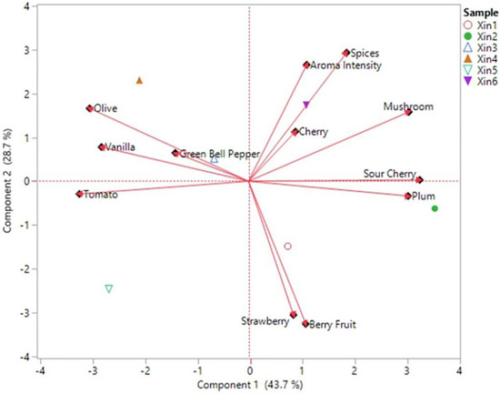 A PCA biplot of the sensory attributes helped visualize the results described above, with the research wines separating into three groups (Figure 3). The first group includes Xin1 and Xin2, which were generally characterized by fruity aromas, including strawberry, cherry, sour cherry, berry fruit, and plum. The other group consists of Xin3, Xin4, and Xin5, which were related to the vegetative group of sensory attributes (tomato, green bell pepper, and olive), along with vanilla. On the contrary, wine samples Xin3 and Xin4 were less influenced by berry fruit and strawberry attributes. Wine sample Xin6 was associated with spices, mushroom, and cherry descriptors and overall aroma intensity, but presented low correlation with berry fruit and strawberry descriptors. These results agree with the sensory profile of Xinomavro wines as presented by the official website of “Wines of Greece” [25]. According to the description, Xinomavro young red wines are characterized by red fruit, spices, and vegetal aromas.