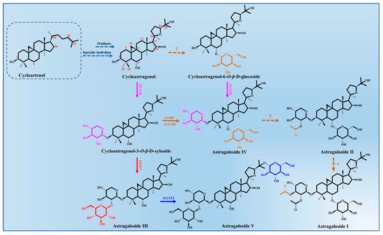 - Duan, Y.; Du, W.; Song, Z.; Chen, R.; Xie, K.; Liu, J.; Chen, D.; Dai, J. Functional characterization of a cycloartenol synthase and four glycosyltransferases in the biosynthesis of cycloastragenol-type astragalosides from Astragalus membranaceus. Acta Pharm. Sin. B 2023, 13, 271–283. [Google Scholar] [CrossRef]
