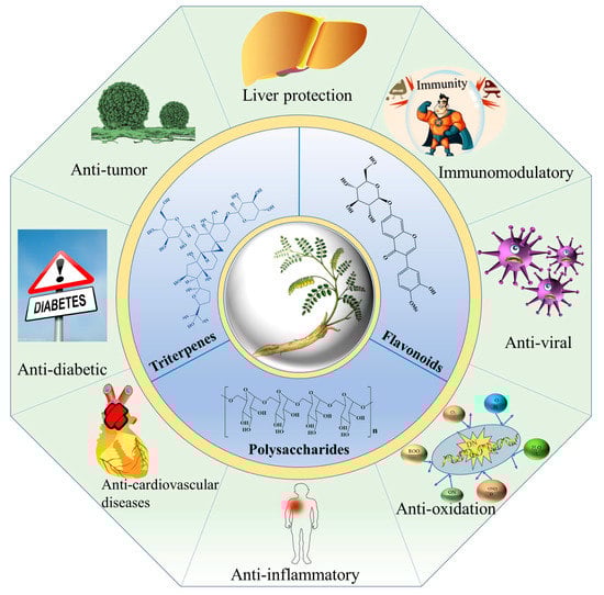Dong, M.; Li, J.; Yang, D.; Li, M.; Wei, J. Biosynthesis and Pharmacological Activities of Flavonoids, Triterpene Saponins and Polysaccharides Derived from Astragalus membranaceus. Molecules 2023, 28, 5018. https://doi.org/10.3390/molecules28135018