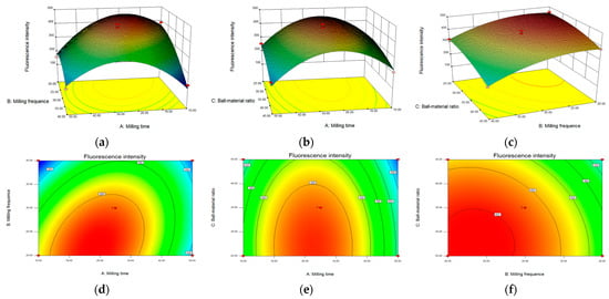 The F value of the model was 34.14, and p value was less than 0.001, which indicated the significance of the model. Additionally, the F value of the lack-of-fit item was 2.5 and the p value was greater than 0.05, indicating that the lack-of-fit was not significant (Table S3). Among the factors, the order of the F value sizes was factor B (milling frequency) > factor C (ball–material ratio) > factor A (milling time), illustrating that the milling frequency had the greatest impact on the final product’s fluorescence intensity in the mechanochemical method. Error regression analysis was performed on the relevant data, and the calculation results showed that R2 and Adj R2 were both greater than 0.9, and the difference between Adj R2 and PredR2 was less than 0.2 (Table S4). The nonlinear relationship between milling frequency, milling time, ball–material ratio and fluorescence brightness was quite significant, indicating the good fit, strong significance and high reliability of the model, which demonstrates its applicability in predicting and analyzing the experimental results.