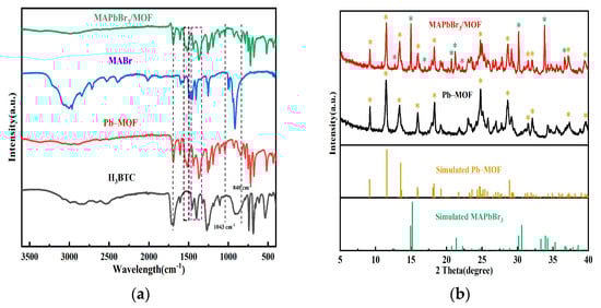 Infrared spectrum (a) and XRD patterns (b) of Pb–MOF and MAPbBr3/MOF composites; the yellow asterisks in subfigure b represent the main simulated characteristic diffraction peaks of Pb–MOF, the green asterisks represent the main simulated characteristic diffraction peaks of MAPbBr3.