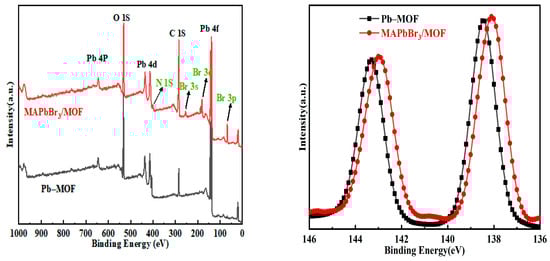 XPS elemental pattern and fitting analysis of Pb–MOF and MAPbBr3/MOF composite (a) full spectrum; (b) Pb 4f spectra.