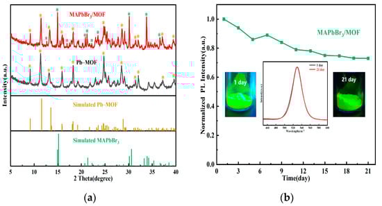 The XRD patterns (Figure 5a) of the Pb–MOF and MAPbBr3/MOF composite still matched well with the simulated ones after being exposed to ambient atmosphere for 21 days, which demonstrated that the Pb–MOF and the composite were relatively stable in air. To investigate the emission stability of the MAPbBr3/MOF composite, the PL intensity of the MAPbBr3/MOF was also monitored. As shown in Figure 5b, the composite preserved 73% of the initial PL intensity with almost unchanged peak shape, suggesting that the emission properties of the composite were maintained [12]. Combining all the experimental results, we infer that the role of the Pb–MOF is mainly to provide a special Pb source and growth environment for MAPbBr3, and could prevent deterioration of MAPbBr3 in the air.