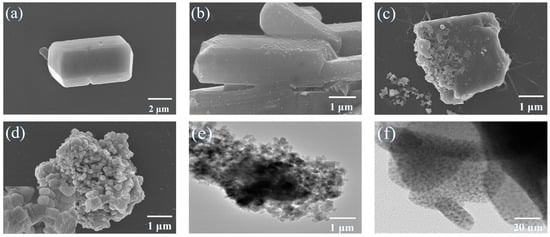 The morphological changes in the system at different reaction stages during the preparation of MAPbBr3/MOF via the mechanochemical method were analyzed by scanning electron microscopy, which aimed to investigate the transformation process. According to Figure 6, prior to conversion, Pb–MOF was a smooth layered hexahedron of micrometer scale (Figure 6a). Upon addition of MABr and under the action of mechanical milling, the microstructure of the material underwent a transformation: in the initial stage (1 min), MABr diffused into the surface of Pb–MOF and reacted with the Pb ions in the Pb–MOF to form a small amount of MAPbBr3, leading to roughening of the surface (consistent with the surface-priority coordination binding reported by Burlakov [18] (Figure 6b). With increased milling time, the bulk Pb–MOF partially crushed under the action of mechanical force, and more Pb ions were released from the Pb–MOF and transformed into MAPbBr3, leading to the appearance of two phases, presenting as small particles and large lumps similar to the initial Pb–MOF (Figure 6c). After 5 min of milling, the composite became more uniform, and resulted in hexagonal particles of 200–400 nm (Figure 6d and Figure S2a). Transmission electron microscopy characterization also confirmed the above conversion process (Figure 6e). From Figure 6f, it can be observed that the particle size of MAPbBr3 on the surface of the composite was about 5.2 nm after complete conversion (Figure S2b), with an increase in the number of MAPbBr3 particles. Although the morphology of the composite was significantly different from the initial Pb–MOF, part of the Pb–MOF still remained and co-presented with MAPbBr3 in the composite (certificated by the XRD pattern in Figure 3b). Meanwhile, benefiting from the increased the reaction sites generated from the crush of Pb–MOF during mechanical grinding, more MAPbBr3 was generated [11], which explained the significant enhancement in the content of MAPbBr3 (calculated from the XPS data in Table 1).