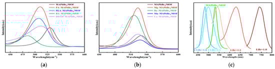 The fluorescence spectra of different doped MAPbBr3/MOF composites (a) organoamine doped system; (b) metal bromide doped system; (c) halogen doped system.