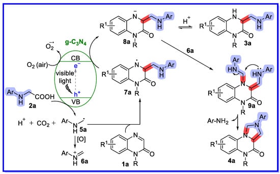A free radical reaction mechanism has been proposed, as shown in Scheme 4 [41]. Upon irradiation with visible light, the semiconductor g-C3N4 was excited to generate electrons and holes, which play an important role in organic transformations by acting as single electron acceptors and donors, respectively. First, the radical intermediate 5a was formed through a photo-oxidation process by releasing a CO2 molecule and a proton. The radical 5a was then added to the C=N bond of 1a to provide intermediate 7a. Intermediate 7a then underwent a single electron photoreduction to produce the anion 8a. The intermediate anion 8a could be converted into the product 3a after protonation. On the other hand, the oxidation of the radical 5a provided the iminium species 6a. The combination of the iminium species 6a and the anion 8a provided the intermediate 9a, followed by intramolecular cyclization to provide the product 4a through the release of ArNH2. The presence of aromatic amines was confirmed by electrospray ionisation (ESI) mass spectrometry.