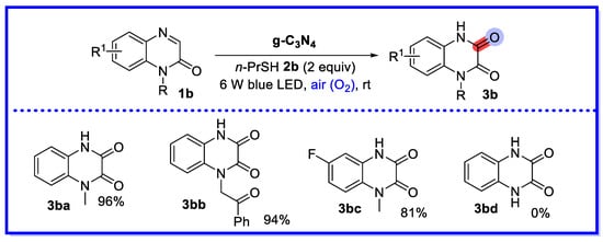 In 2022, Peng and co-workers proposed a heterogeneous visible light-induced direct C–H hydroxylation of quinoxalin-2(1H)-ones (Scheme 5) [42]. The method uses g-C3N4 as a photocatalyst under air conditions and yields a variety of 3-hydroxyquinoxalin-2(1H)-ones by simple washing and filtration. The hydroxylation reaction of quinoxalin-2(1H)-one was studied cyclically under standard conditions. At the end of the reaction, the g-C3N4 photocatalyst was recovered and dried from the reaction mixture by simple filtration and rinsing with the reaction solvent, then directly reused in the next round. The reaction was repeated up to six times with no significant loss of catalytic activity. It is worth noting that the reaction does not proceed smoothly in the absence of thiols or in an N2 environment. This indicates that thiols and oxygen are necessary for the reaction. An identical reaction was carried out in a homogeneous catalytic system using a DL-α-tocopherol methoxy-polyethylene glycol succinate solution (2 wt% water) (TPGS-750-M/H2O) as catalyst. However, this approach has the disadvantage of using large excesses of environmentally unfriendly inorganic strong oxidants and harsh reaction conditions, which generates chemical waste and increases manufacturing costs [43].