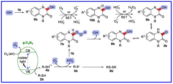 Based on controlled experiments and references in the literature, the reaction mechanism shown in Scheme 6 was proposed [42]. First, g-C3N4 is excited by visible light to produce an electron in the conduction band (CB) and a hole in the valence band (VB). The VB hole then gains an electron from the thiol 2b to form the thiyl radical cation 4b through a single electron transfer process. At the same time, an electron from the CB is transferred to O2 (air) to form O2•−, which has been confirmed by EPR analysis using 5,5-dimethyl-1-pyrroline (DMPO) as a spin trapping agent. Next, O2•− abstracts hydrogen from the thiyl radical cation 4b to form HO2• species and thiyl radical 5b. The resulting HO2• can then selectively attack the C-3 position of 1a to form intermediate 7b. Intermediate 7b may undergo homolytic cleavage under visible light irradiation to produce 8b and the hydroxyl radical HO•. The hydroxyl radical HO• adds to the C=N of 1b to provide the nitrogen radical intermediate 9b, which undergoes further oxidation by HO2• or O2 to provide the nitrogen cation intermediate 10b. Deprotonation of intermediate 10b provides intermediate 8b. Finally, intermediate 8b undergoes rapid tautomerisation to provide the more stable product 3b. Meanwhile, the thiyl radical 5b can rapidly dimerise to form disulfides 6b.