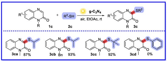 In the same year, Xie et al. reported a sunlight-induced and g-C3N4-catalysed sulfenylation reaction of quinoxalin-2(1H)-ones under air conditions (Scheme 7) [44]. The reactions of this method offer a very attractive and practical way to selectively obtain a wide variety of 3-sulphated quinolin-2(1H)-ones in good to excellent yields. In addition, the heterogeneous catalyst can be easily recycled up to six times while maintaining high catalytic activity. Interestingly, and providing a basis for mechanistic studies, the reaction does not proceed properly under N2 conditions or in the dark. Two reactions of the same type have been reported, with good results obtained with visible light-induced homogeneous catalytic systems using Rhodamine 6G and Rhodamine B as photocatalysts, although in non-recyclable reactions [45,46].