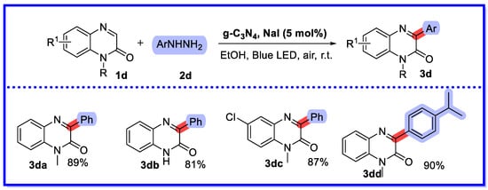 In 2023, He et al. first proposed the formation of 3-arylquinoxaline-2(1H)-ones under blue light irradiation using g-C3N4/NaI semi-heterogeneous bis-catalysed quinoxaline-2(1H)-ones and arylhydrazines (Scheme 9) [47]. Their method yielded a wide variety of 3-arylquinoxalin-2 (1H)-one products in high yields with good functional group tolerance. Similar to the g-C3N4 photocatalyst described above, the desired product was not detected in the absence of molecular oxygen or light conditions. The reaction yield at the gram level was 72%. Cycling experiments with the g-C3N4 catalyst showed that it could be recovered and reused at least five times without significant loss of catalytic activity. In 2017, direct oxidative arylation homogeneous reactions of quinoxaline-2(1H)-ones prepared under air conditions without transition metal iodobenzene promotion were reported using different arylhydrazides as starting materials. In comparison, photocatalytic heterogeneous reactions are more environmentally friendly [48].