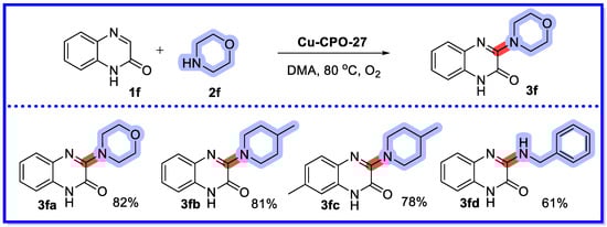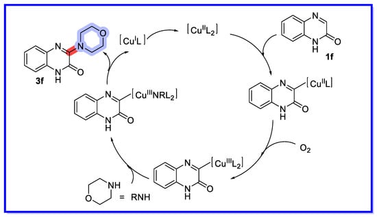 A possible reaction mechanism can be deduced from controlled experiments and literature reports (Scheme 14) [61]. Initially, deprotonation of quinoxalin-2(1H)-one (1f) forms the pyridinocopper(II) species. Subsequent oxidation of copper (II) by oxygen produces copper (III) species, which undergo nucleophilic substitution with morpholine to form aminocopper (III) species. Reductive elimination follows the single electron oxidation to regenerate the original catalyst. There is doubt as to the mechanism of this reaction. We think it unlikely that Cu3+ appears in the catalytic cycle, while it is not clear where the hydrogen disappears from in this scheme.