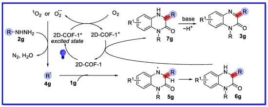 A possible heterogeneous visible light-accelerated C3 arylation and alkylation reaction pathway has been suggested by radical inhibition experiments, calculation of apparent quantum efficiency (450 nm) values, and other relevant reports (Scheme 16) [63]. First, 2D-COF-1 is excited by the blue LED irradiation and subsequently reduces the oxygen to form a singlet oxygen radical and a superoxide radical anion, which oxidises the hydrazine 2g with the loss of nitrogen and water to provide the nucleophilic cyclohexyl radical 4g. Next, it reacts with the electron-deficient 1g to provide the radical intermediate 5g. The 1,2-H shift of radical 5g then provides the carbon radical intermediate 6g. Intermediate 6g undergoes single electron transfer (SET) with 2D-COF-1+ to provide the carbon cation intermediate 7g. This is finally converted by deprotonation to the desired product 3g.