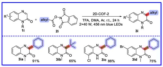 In 2021, Yang’s group described a visible light-driven decarboxylative alkylation reaction of heterocycles, including quinoxalin-2(1H)-one, catalysed by an olefin-linked covalent organic framework (2D-COF-2) instead of the commonly used noble metal complexes and organic dyes (Scheme 17) [64]. A variety of alkylated heterocycles were selectively and efficiently synthesised under non-homogeneous reaction conditions. Twenty-seven quinoxalin-2(1H)-one substrates were reported, with yields ranging from 61–97%. 2D-COF-2 relies on the super-stability of the olefin chains to maintain its basic structure and photoactivity under strongly acidic conditions. Furthermore, the structure, porosity, and crystallinity of the catalysts were confirmed by 13C solid-state NMR spectroscopy, Fourier transform infrared (FT-IR) spectroscopy, N2 adsorption measurements, and powder X-ray diffraction (PXRD). In addition, its potential for industrialisation in recycling experiments, functionalisation of bioactive molecules, and scale-up reactions has been demonstrated. Homogeneous photocatalysts for the same type of reaction have been limited to noble metal complexes and organic dyes, and the heterogeneous approach is advantageous from a green and sustainable chemistry perspective.