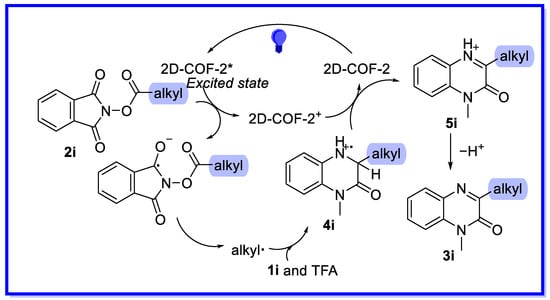 Combining controlled experiments and their inherent optoelectronic properties, a preliminary mechanism can be proposed (Scheme 18) [64]. Under visible light irradiation, the excited 2D-COF-2 can directly reduce the NHPI ester 2i by single electron transfer to form alkyl radicals with loss of CO2. The alkyl radical then attacks the low electron density site on isoquinoline 1i, which is activated by TFA, resulting in the formation of the radical cation intermediate 4i. Intermediate 4i is then oxidised by 2D-COF-2+ to provide the alkylated isoquinoline cation 5i with photocatalyst regeneration. Finally, the desired product 3i is obtained by deprotonation.